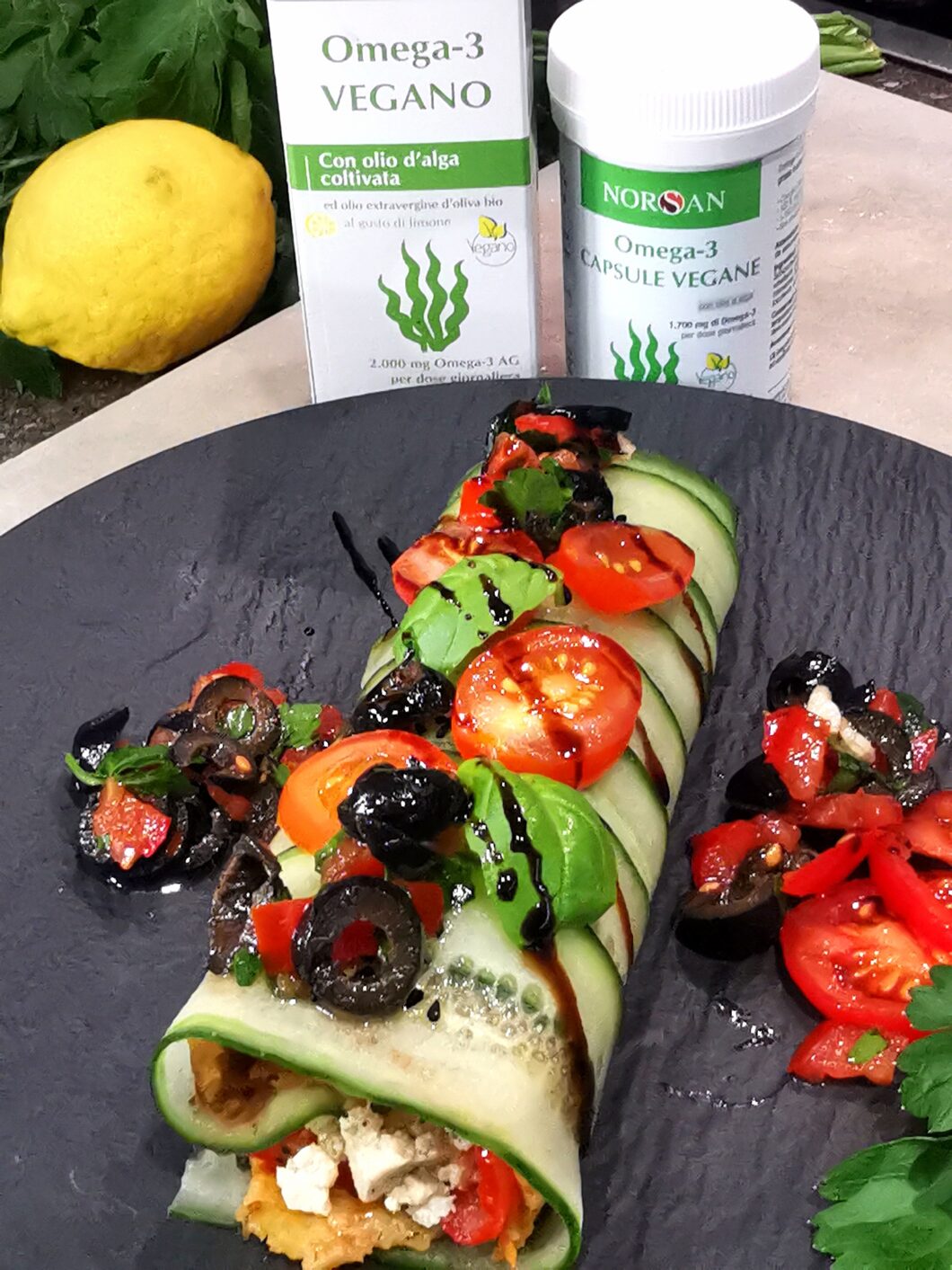 Si tratta di un ANTIPASTO leggero e piacevole, facile da preparare, cui ho aggiunto L'OMEGA-3 vegano della Norsan, che io supplemento ogni giorno.