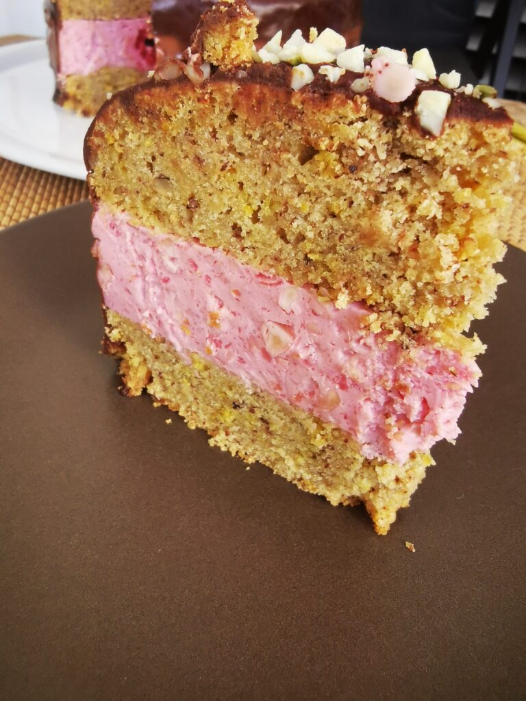 Der Kuchen muss in der Backform bleiben, Himbeeren einstecken und Kuchen in den Kühlschrank mindestens zwei Stunden stellen.