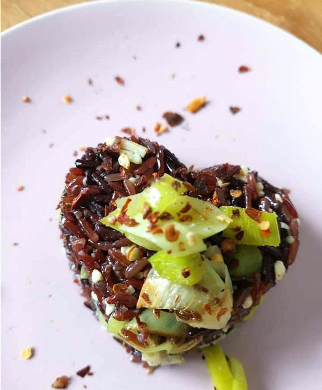 Risotto heiß servieren und mit dem Lauch dekorieren.