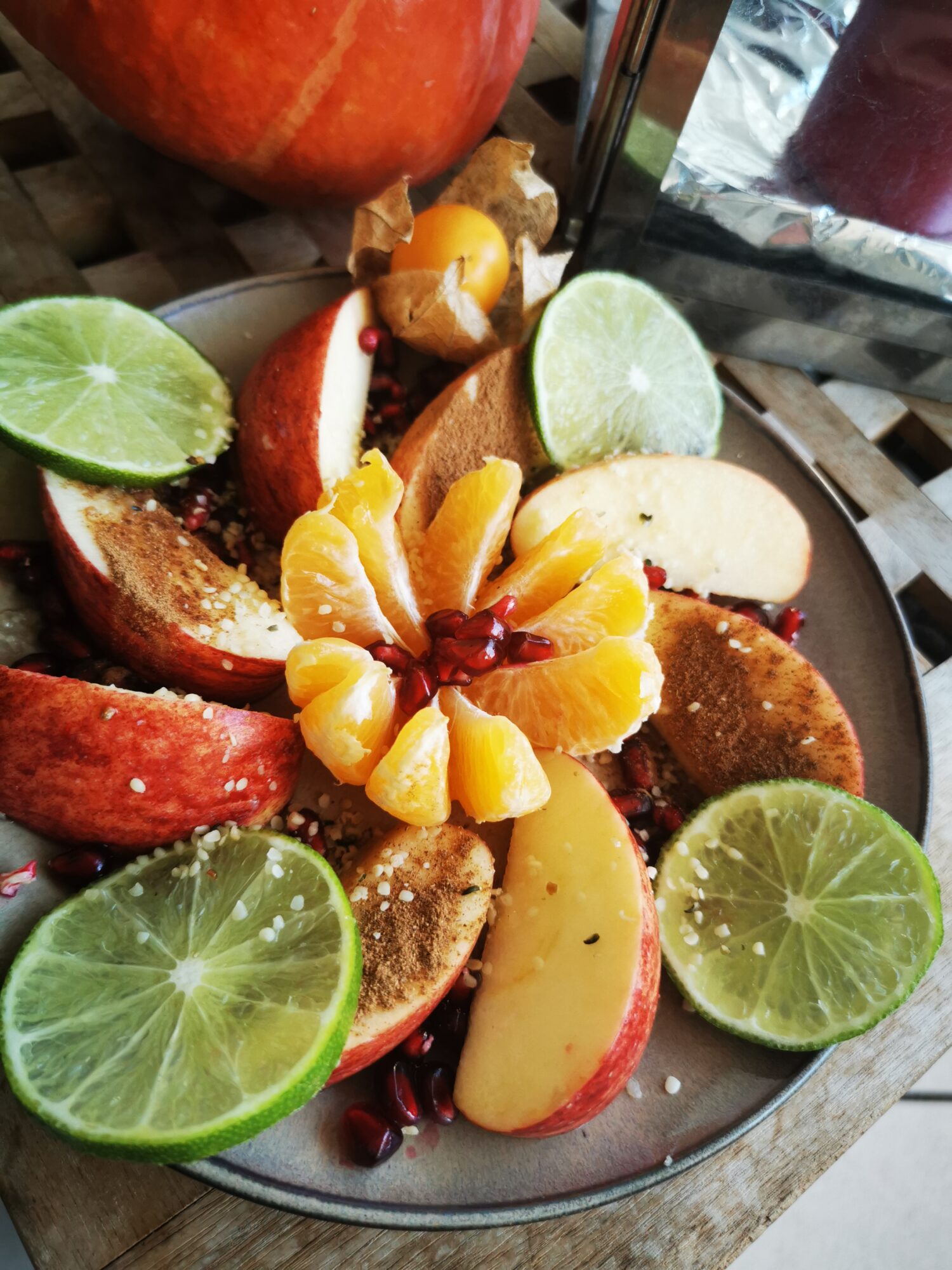 Apfel schneiden und im Kreis auf den Teller stellen. Mandarine schälen und in der Mitte positionieren. Granatapfel öffnen und die kleine Teile am Teller verteilen
